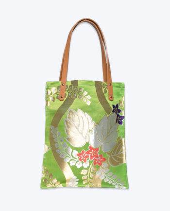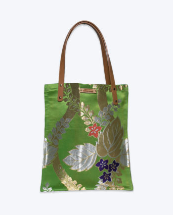 Medium black tote with a sophisticated arabesque pattern on a black background. Created from upcycled vintage obi. This bag has an inner pocket, faux leather black handles with metal hardware finished with a beautiful vintage flower brooch (from the UK). The Obi is crafted in its original form therefore it is padded so provides protection for your fragile gadgets. Beautiful, practical and strong this bag is perfect for an evening out, a special occasion or a gift.